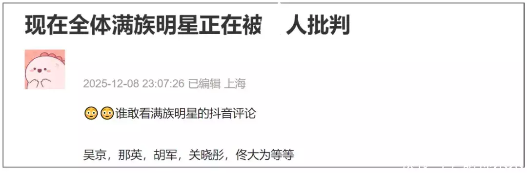 最近一大波明星们的族谱纷繁被扒,满族降生的多位明星深陷公论场,包括吴京、关晓彤、惠英红、那英、胡军等,他们皆曾在节目中或多或少地显示过我方的降生,这些旧闻激励了争议。